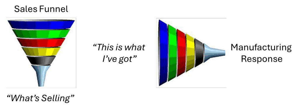 There is also a need for ongoing feedback during the ensuing period: sales communicating “what’s selling” and manufacturing providing what’s available (“what I’ve got”), turning the sales funnel into a megaphone (i.e., “I’m out of Prime Rib! Push the Meatloaf!”)