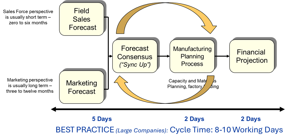 The process is a cycle. Sales and marketing provide forecast data from their various perspectives which “syncs up” into a demand forecast (what I want). This is provided to manufacturing (including purchasing) to generate material and capacity planning and a response to the demand forecast (what I can produce). There may be multiple cycles here, but eventually a consensus is reached and provided to finance to generate the financial forecast. [2]