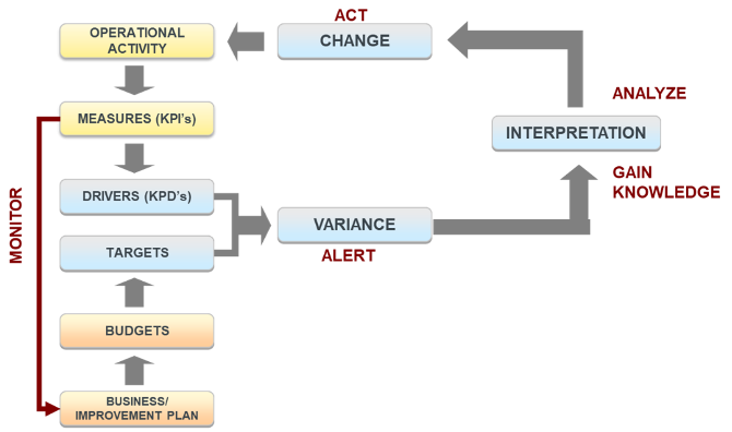 - Monitoring measures drivers against targets, goals and best practices, identifying issues, understanding the nature of the issues and ultimately identifying corrective action as needed.